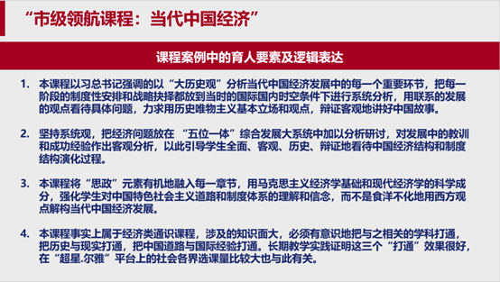 石磊指出,课程育人重在以科学的理论和正确的价值观育人。他分享了“当代中国经济”这门市级领航课程的教学设计与教学案例,为大家系统梳理课程案例中的育人要素及逻辑表达。“课程育人需要完整的知识体系,要根据课程性质和可能,将专业知识与育人元素逻辑合理地融汇成完整的育人知识体系,力求润物无声。”