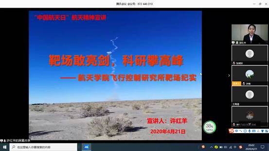 4月21日,飞行控制研究所党支部张明环,学生支部博士生许红羊,做“靶场敢亮剑、科研攀高峰”中国航天日主体宣讲,在线人数约300人次,受到广大航天爱好者的称赞。