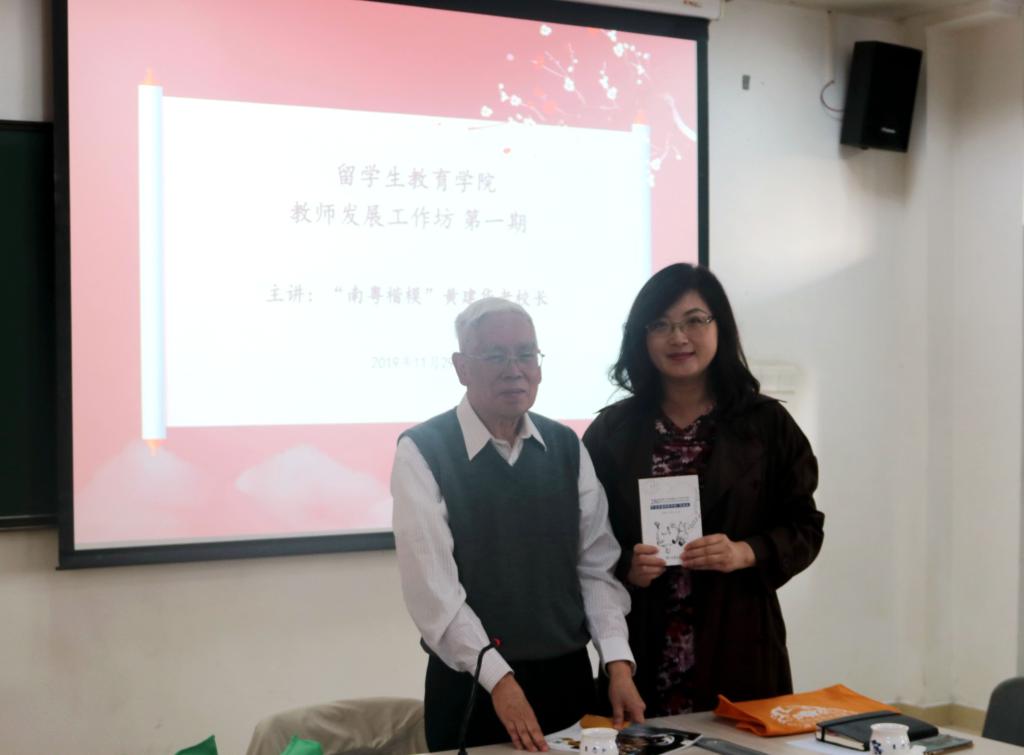 为促进全院教工的人生发展,为员工事业进步、身心健康、人生幸福提供指导、辅导和交流的平台,留学生院党支部成立“留学生教育学院教师发展工作坊”。11月29日下午,首期工作坊在第七教学楼217室成功举行,大学思政宣讲团成员,“南粤楷模”黄建华教授作开班报告,并向留学生院全体教职工分享了他的人生和治学经验。
