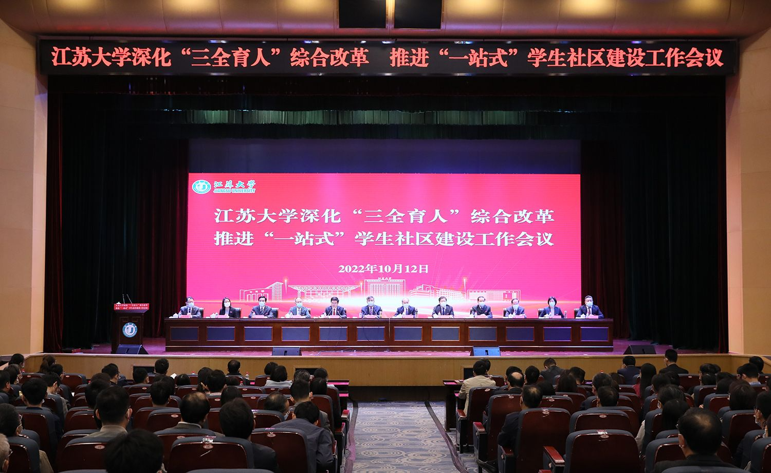 10月12日,江苏大学召开深化“三全育人”综合改革,推进“一站式”学生社区建设工作会议,总结三年来我校“三全育人”综合改革工作的主要成绩,分析新时期高校人才培养面临的新形势新要求,全面部署学校深化“三全育人”综合改革、推进“一站式”学生社区建设工作。