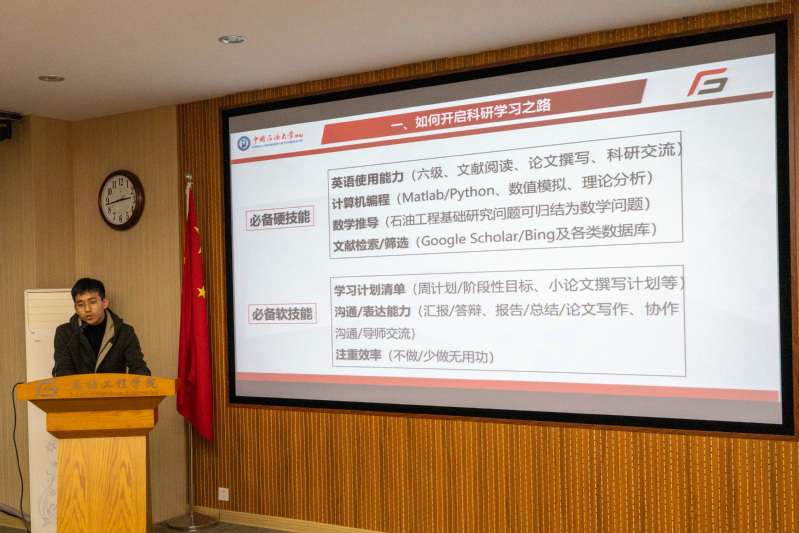 为深入推进研究生学风建设,响应我校第十届“研究生科学精神与学风建设月”活动精神,营造思想碰撞、学术争鸣的良好科研风气,12月17日,石油工程学院研究生学术经验分享交流会顺利举行,活动共邀请6名优秀研究生代表进行科研及竞赛经验分享交流,共30余名研究生参加活动。