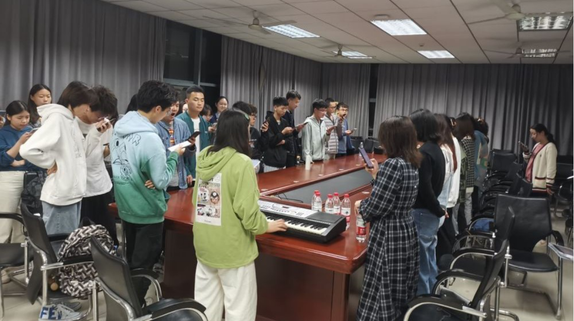 “虽不曾看见长江美,梦里常神游长江水,虽不曾听见黄河壮,澎湃汹涌在梦里………”,4月中旬以来,每天晚自习后,不论刮风下雨,学院10名教师和40名同学组成的“五月花海”合唱团都坚持一起练习这首《龙的传人》,这是学院献给党百年华诞的一曲赞歌。“之所以选择《龙的传人》这首歌,是因为歌曲中充满了对祖国河山、人文、历史的歌颂,她蕴含着一股浓浓的民族自豪感和爱国情怀”,歌唱团负责人艾俊说。