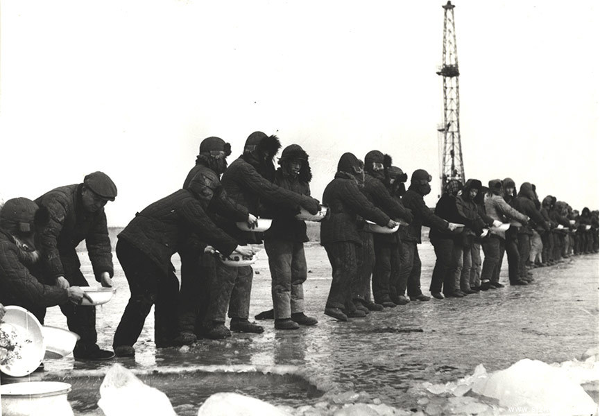 水井的水给打干了,还不够,大家又奔向距离井场三里远的泡子里取水,大家一会小跑,一会紧走,恨不得一下把水端到井场上。