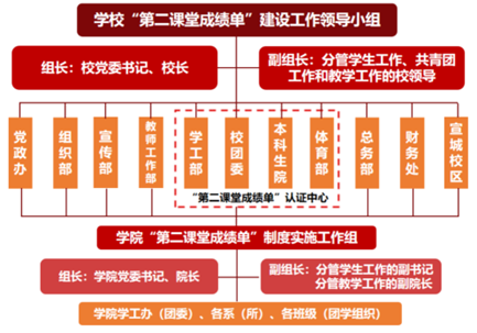 2.校院联动保障第二课堂教育落地生效。成立由党委书记和校长任组长,相关职能部门、各学院负责人为成员的“第二课堂成绩单”建设工作领导小组,加强对第二课堂教育的顶层设计、推进实施、督促指导。日常工作由团委、教务等部门统筹、协调与管理,解决多部门、多学院协同问题。成立由校团委、党委学生工作部、本科生院、体育部组成的“第二课堂成绩单”认证中心,由学院党委书记和院长任组长、党委副书记和分管教学副院长任副组长的制度实施工作组,保障第二课堂教育各项部署得到全面贯彻和有效落实。