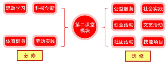 1.关联第一课堂教学设计“第二课堂成绩单”模块架构。坚持把立德树人作为中心环节,探索实践教育与创新创业教育相结合、课堂学习与课外学习相结合、个性化培养与全面发展相结合的人才培养机制。对应第一课堂的“通识教育、公共基础教育、专业教育、创新创业教育”四大课程模块,面向工程教育专业认证标准要求和学生德智体美劳全面发展需求,把握第二课堂教育特征,构建“4+6”模块化“第二课堂成绩单”,保障第二课堂与第一课堂有效衔接。“4”是指4个必修模块,即:思政学习、科技创新、体育健身、劳动实践;“6”是指6个选修模块,即:创业活动、公益服务、社会实践、文艺活动、社团活动、技能项目。模块架构体现出德智体美劳全面发展要求在第二课堂教育各领域和各环节的具体落实,形成价值塑造、创新实践、技能拓展、素质养成与知识传授相结合的育人格局。