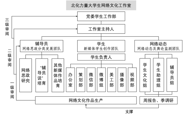 工作室在学校党委学生工作部的指导下,有工作室主持人牵头,从辅导员、学生创作、网络动态监测角度分为三个团队,为及时了解学生动态、创作立足于学生需求和需要的网络文化内容提供有力保障。