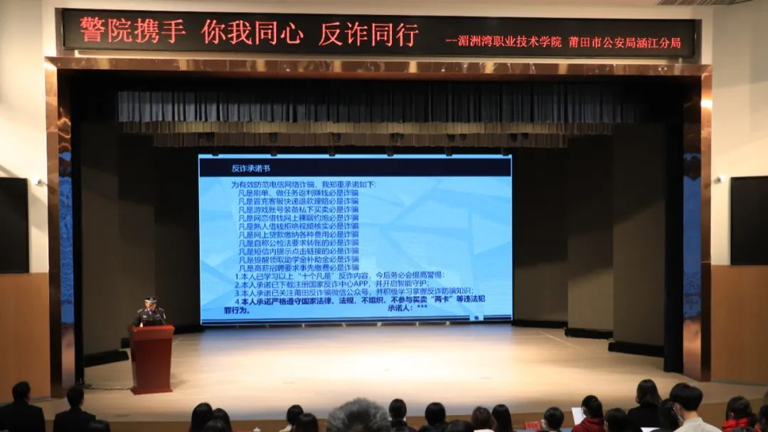 近年来,湄洲湾职业技术学院和涵江警方密切配合,签订警校共建协议书,依托莆田市公安局梧塘派出所湄洲湾职业技术学院警务室,持续和发展新时代“枫桥经验”,先后开展了“防骗知识大宣传活动”“开学第一课”“全民国家安全教育日宣传活动”等反诈骗讲座10场,建立反诈骗班级微信群410个,面向全院1.5万余名师生开展反诈骗宣传,成功电话预警20余人次,劝阻挽损金额数十万元,取得了明显成效。