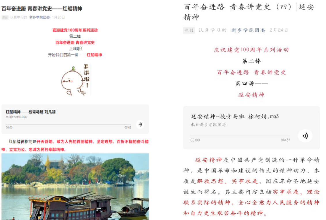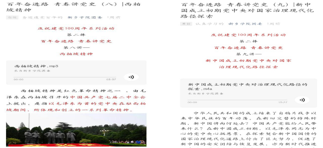 青年宣讲作为新乡学院共青团庆祝建党100周年的系列活动之一,青马班于今年年初率先开展了以“百年奋进路 青春讲党史”为主题的线上宣讲。在精心策划下,学员们共分为13组,已完成9期推送。