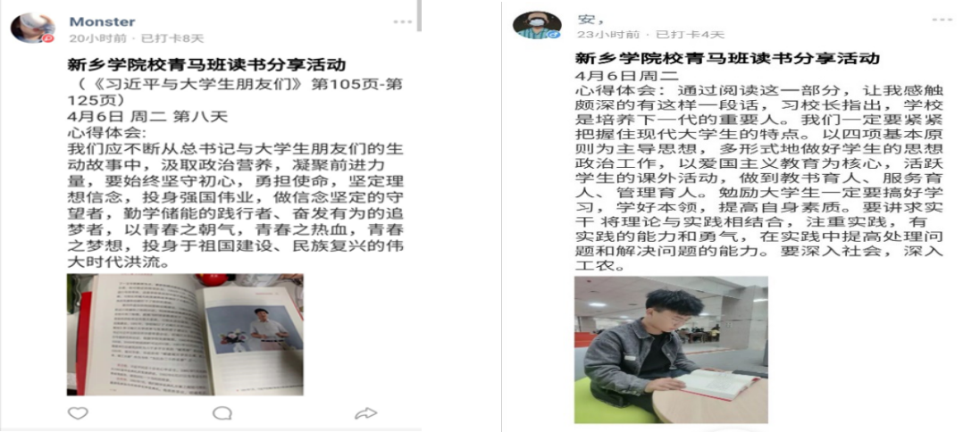 本期青马班开班以来,学员们坚持开展读书打卡活动,结合今年建党100周年的主线以及“学党史 强信念 跟党走”学习教育的要求,选取了《习近平与大学生朋友们》《中华人民共和国国史》《中国共产党简史》等为必读书目。