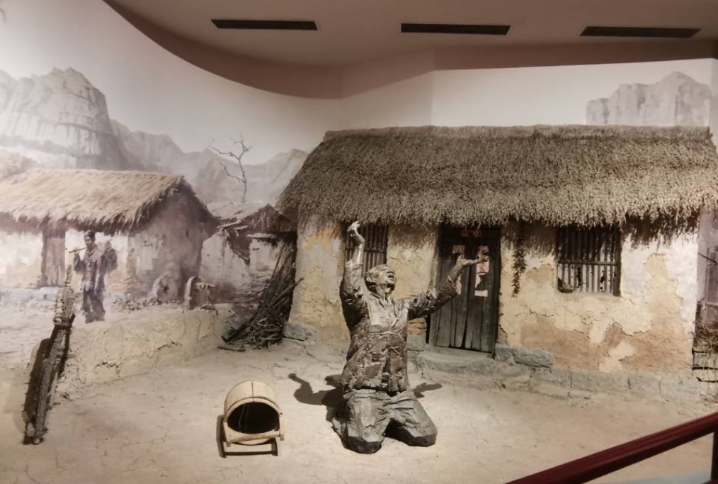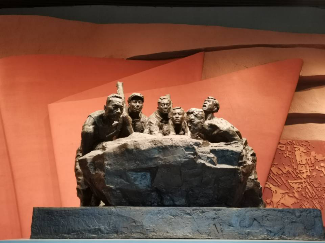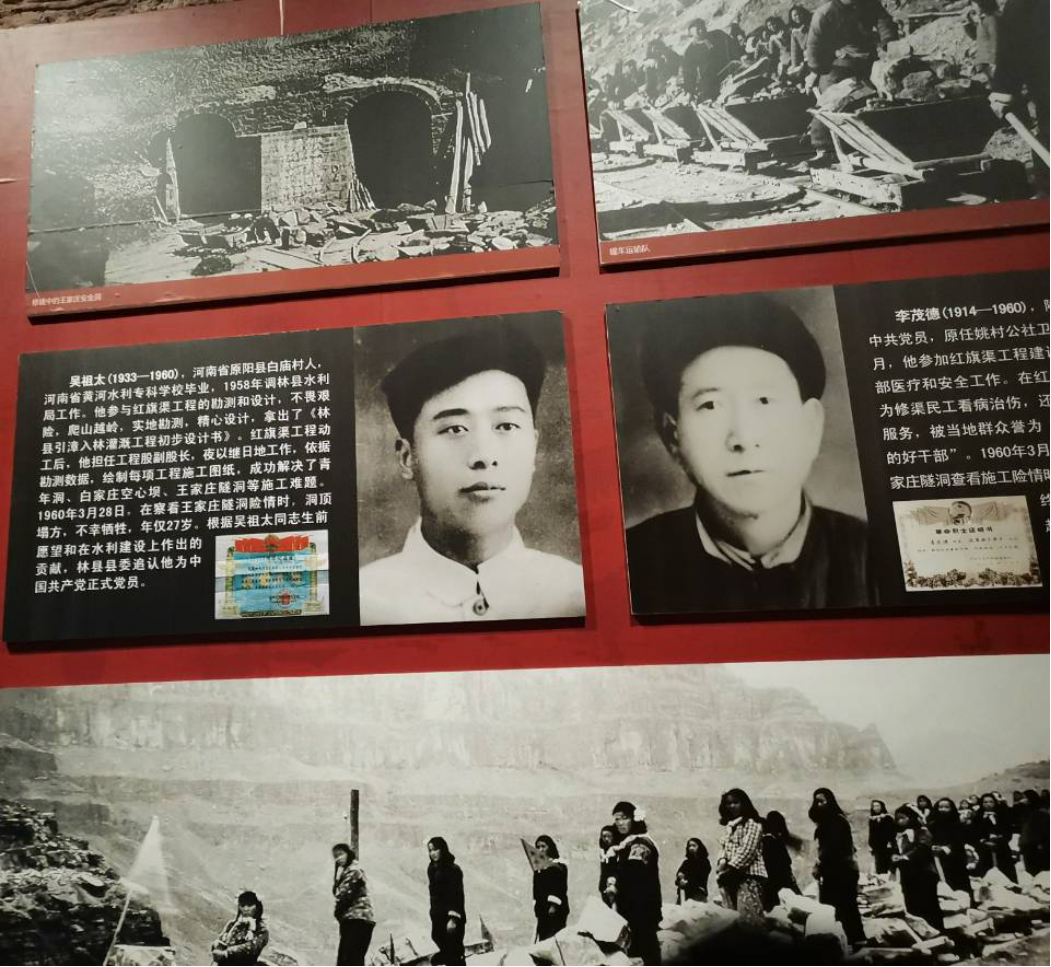 展厅陈列了红旗渠沙盘模型、修建时珍贵实物、照片、场景雕塑等等,似乎能让人亲身感受红旗渠修建时的艰难历程:上世纪六十年代林州人民,身处严重缺水的生活环境,在党的领导下,凭着锤钎和双手,“逢山凿洞,遇沟架桥”,“削平1250座山头,凿通211个隧洞,架设152座渡槽,历经10年”在太行山腰上建成全长1500公里引水灌溉之用的红旗渠。