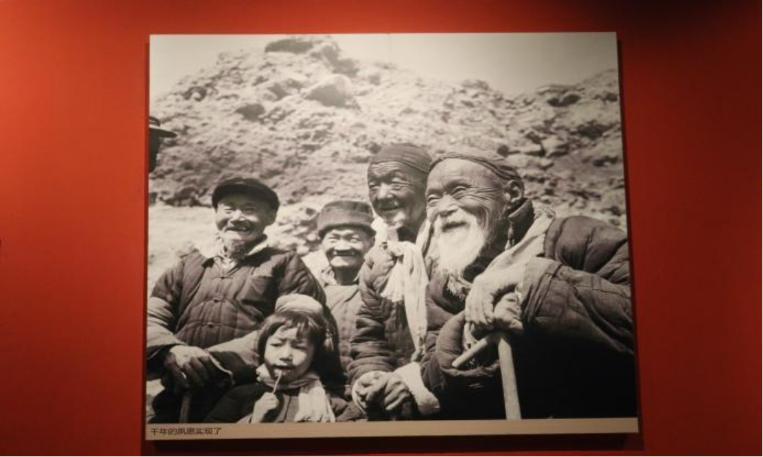 经采访,实践小组了解到原来老人就是当年红旗渠建设大军中的一员,桂计生。当年投身建设的他年仅14岁。岁月不居,已逾古稀的桂计生和曾经14岁的少年以一种特殊的方式“相见”。桂计生颤抖地指向一个戴帽子的少年,激动地开口:“我那年14岁,那天是红旗渠开渠典礼,当时我在人群里面,现在还有这个图像,我可以找到,是这一张。我那时候个子小看不见,一只手扶着旁边人的肩膀,努力踮着脚往对面看,挺隆重的当时。”画卷中可以看出,渠畔人潮拥挤、万分激昂,林县人民多年的夙愿在那一天终于实现了。