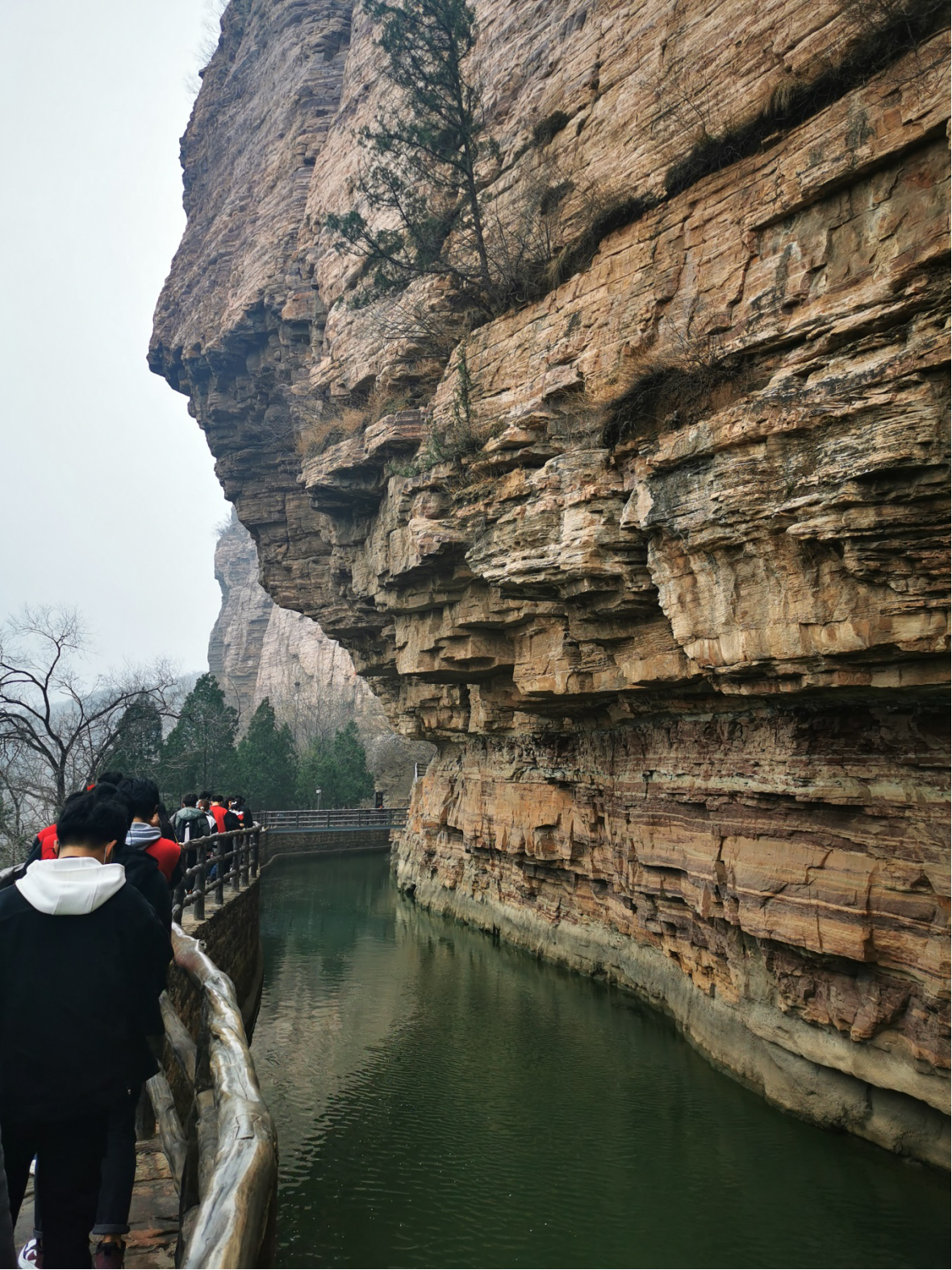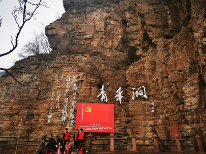 青年洞总长616米,高5米,宽6.2米,处于豫、冀、晋三省交界处,修筑在太行山腰的峭壁之上,因参加凿洞的突击队是从全县民工中抽调出来的300名优秀青年而得名。走在紧贴着山崖凌空而建的栈道上,看着穿山而过的红旗渠水,学生们深刻感受到了“愚公奋起十春秋,引来漳河润田禾”的艰辛和不易,更深刻的体会到了林县人民不畏艰险、艰苦创业的雄心壮志。