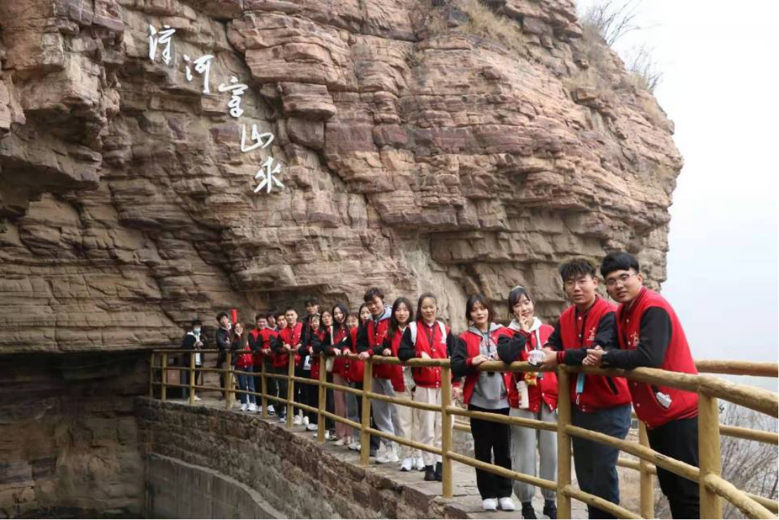 之后,团队代表成员在科学精准有效的防控措施保障下到达红旗渠进行实地考察。成员们对红旗渠有一定的了解,全体成员对红旗渠纪念馆进行参观记录,游览完纪念馆之后稍作休息,便出发前往红旗渠青年洞考察其实况,开始对红旗渠青年洞的全面了解,体会当时的青年艰辛地建设红旗渠的历程和重大意义。沿途而行中看到了红旗渠修建环境的恶劣,在悬崖峭壁上修建红旗渠,他们崖当房、石当床也毫无怨言,他们用着最简单的工具做着极不平凡的事。用“水鸭子”进行测量,用小推车运送一块一块的石头,妇女突击队辛苦地打钎等等很多场景让我们了解了修建红旗渠背后的不易。在青年洞看到人工天河在山崖的腰间蜿蜒流淌,感受红旗渠这一伟大工程的震撼,在青年洞中的霓虹灯掩饰不了修建的艰辛,每一寸的凿面都来自那一群辛苦劳作的年轻生命,劈山开河的老炮眼也是他们艰苦奋斗的象征……在这里的每时每刻无不使我们感动震撼,我们也怀着激动的心情在这里重温了入团宣誓以表达对英雄们的致敬以及让我们传承这份精神。