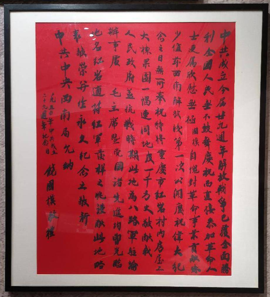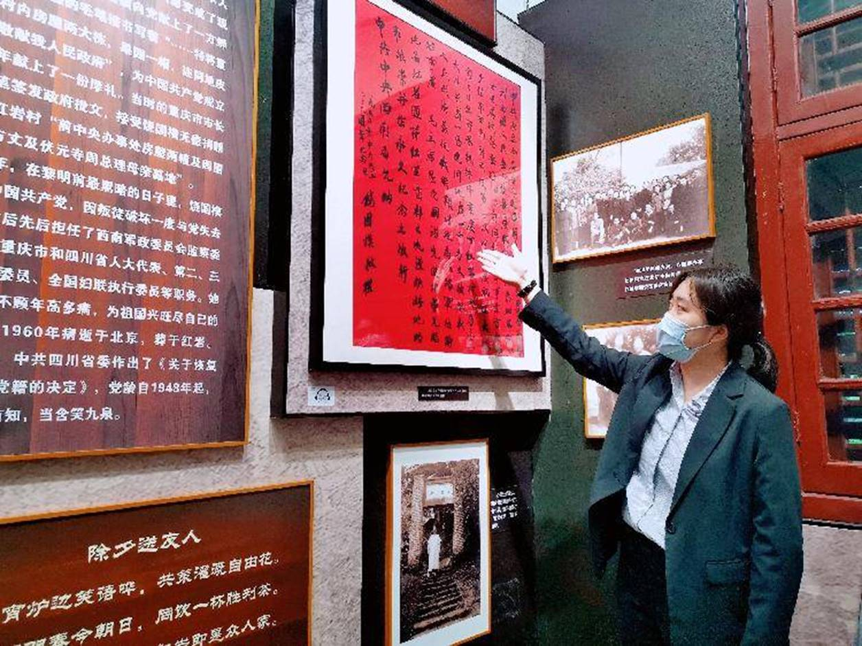 在故居底楼正在举办的“红岩女杰饶国模生平事迹展览”中,记者看到了一件格外醒目的展品,它就是饶国模捐献土地、房屋的红绸信。饶国模在红绸上写道:“……特将重庆市红岩村内房屋两大栋,果园一幅,连同地皮一千方丈敬献我人民政府……”每当王佩雯讲到这里,观众总会赞叹道:“这位老太太真了不起!”