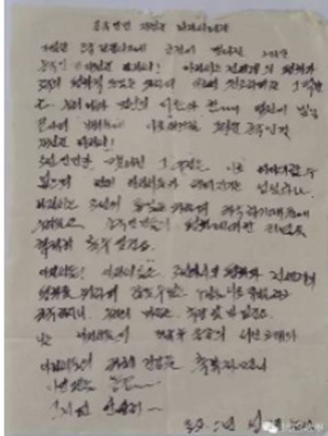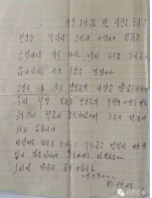 叔叔们!叔叔们为了朝鲜人民的和平和全世界的和平,我们要与此无法断绝的友谊告别,你们回国,无法揣摩我们的心情。我希望叔叔们回国后可以书信交流。 望贵体安康。