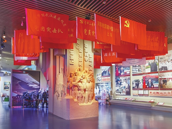 为纪念这场惊心动魄的抗疫大战,中国共产党历史展览馆还原了医护人员逆行出征、挽救生命的感人场景。在场景一侧的展柜中,陈列着一组实物,其中包括一个印有“同饮长江水 共食咸宁鱼”字样的塑料袋、几张2020年4月8日武汉解封当日的机票和火车票,以及中国研发的新冠疫苗。这一逼真的场景和这些看似普通的物品,生动展现了生命至上、举国同心、舍生忘死、尊重科学、命运与共的伟大抗疫精神。