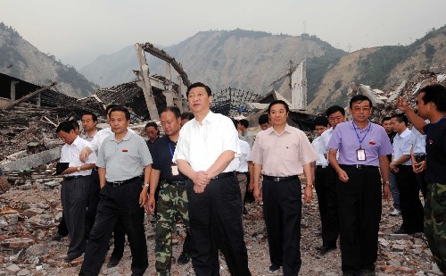2008年6月29日习近平在汶川映秀镇察看地震废墟(新华社记者饶爱民摄)