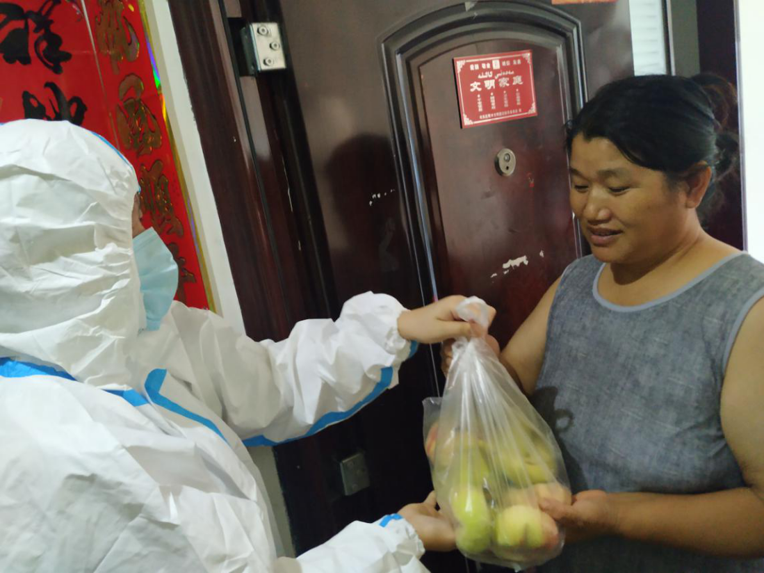 图为实践队员给小区居民送居民所需物资