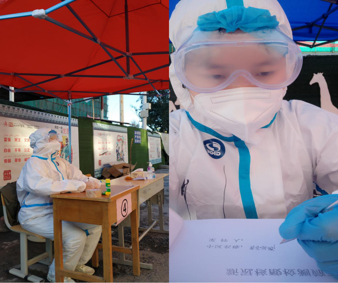 自7月起,新疆乌鲁木齐突发新冠肺炎疫情,疫情来势凶猛,新疆再次按下暂停键。家在乌鲁木齐的实践队员杨玉敏同学和家在塔城的实践队员唐章翼同学第一时间向社区申请成为一名防疫志愿者,参与到家乡防疫抗疫一线工作中,为做好疫情防控工作献出自己的一份力量。在担任志愿者期间,他们每天要处理很多繁杂的工作,每日登计居民体温数据、统计居民所需用品、为居民配送生活物资、收拾清理楼座卫生、对楼道进行消毒工作、小区卡点执勤、社区辖区巡逻.....这些都是他们的工作的常态,一次次的登记信息,一趟趟的往返都只为保障居民生活需求做出了巨大的贡献。
