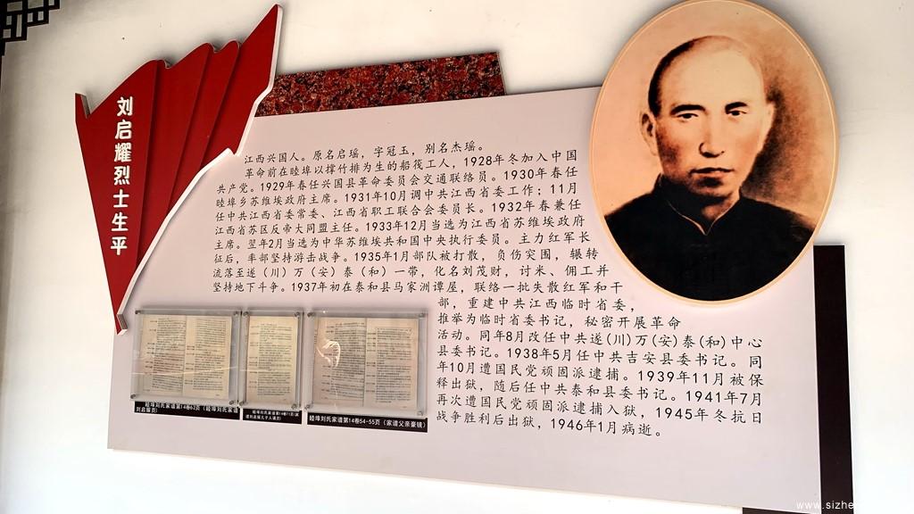 刘启耀(1899~1946),男,江西省兴国县龙口乡人。1928年加入中国共产党,1930年后担任乡苏政府主席、中共江西省委常委、江西省职工联合会委员长、省反帝大同盟主任、江西省苏主席、苏维埃中央执行委员。红军长征后,率部坚持游击斗争,突围中他负伤与组织失散,讨米度日,不动用分毫党的经费。1937年初,他重建中共江西临时省委,推选为书记。后担任中共遂万泰中心县委书记、中共吉安县委书记、中共泰和县委书记等职,多次被捕入狱。