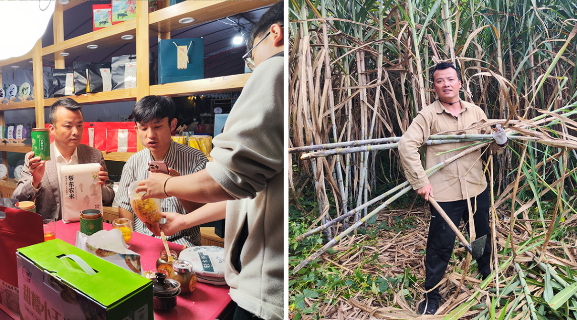 左图为毛明在电商直播推销云南镇康县帮东村的“帮东农米”“金丝大皇菊”等农副产品;右图为毛明在云南镇康县帮东村甘蔗地砍甘蔗。