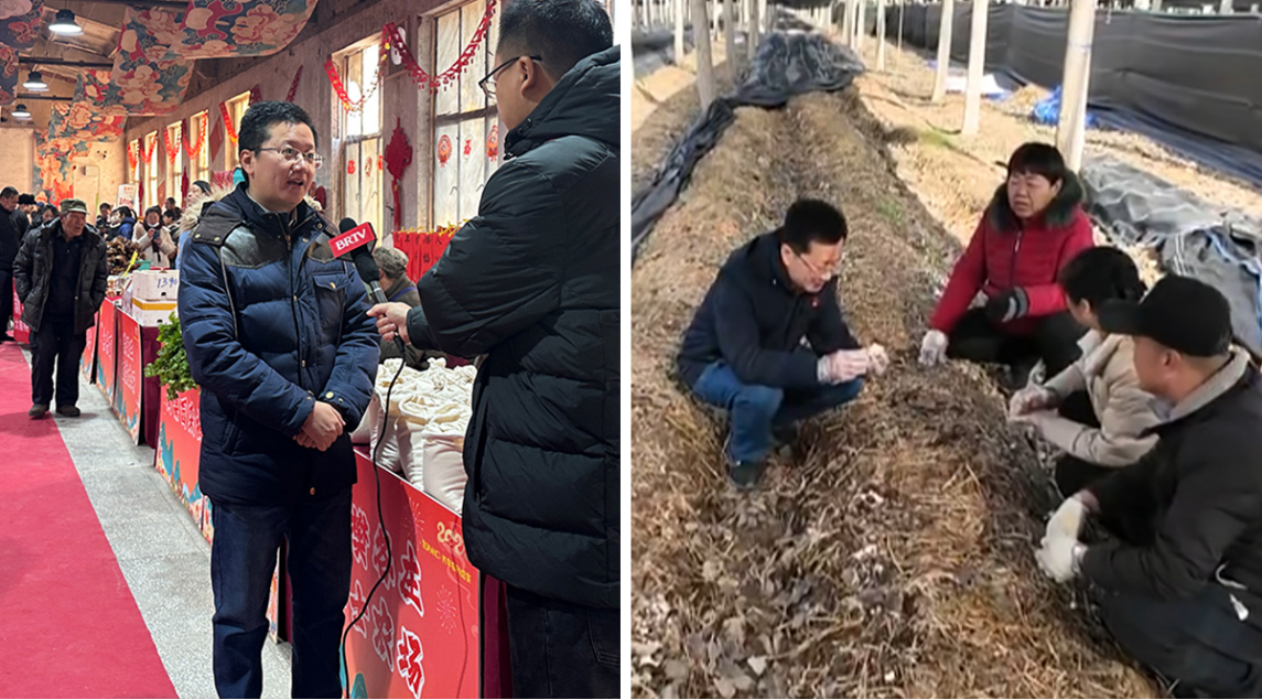左图为沈其林在2025年北京平谷区峪口镇美食文化节上推销农副产品、接受北京广播电视台采访;右图为沈其林在北京平谷区东樊各庄村察看林下赤松茸、中药材种植情况。