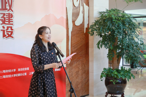 喻世红馆长对专题展作简要介绍。她介绍到:“陈云与党风廉政建设”专题展是学校深入开展学习贯彻习近平新时代中国特色社会主义思想主题教育的一项重要举措,也是学校 2023 年毕业季廉洁文化进校园系列活动的重要内容之一。展览由陈云纪念馆和上海财经大学联合主办,学校纪委办公室、档案馆(校史馆、博物馆)共同承办。“陈云与党风廉政建设”专题展紧紧围绕陈云在党风廉政建设方面的思想和实践以及陈云重视党性修养的生动事迹,全面、系统、深入地展现了陈云坚定的理想信念、系统的党建思想和崇高的党性修养。同时,因为陈云同志与学校的紧密渊源,展览首次展示了 38 年前陈云为学校题写的两幅“上海财经大学”题字真迹原件。