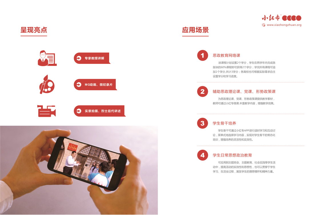 “小红专”是全国唯一一款对标大学生思想政治教育互联网APP产品,其以习近平新时代中国特色社会主义思想、党的十九大精神、梁家河知青岁月、中共党史为主要课程内容,通过5-8分钟的图文、音频、视频等方式进行课程呈现,并采用“一天一课,一课一考题”的学习考核新模式,充分利用了大学生碎片化时间完成了学考全过程,达到了润物细无声的效果,实现了思想政治教育从指间直抵心间的目标。(“小红专”名称说明:“小”是指它的目标用户群为青年大学生;课程短小精致易于传播;“红专”是指培养又红又专、德才兼备、全面发展的中国特色社会主义建设者和接班人。)