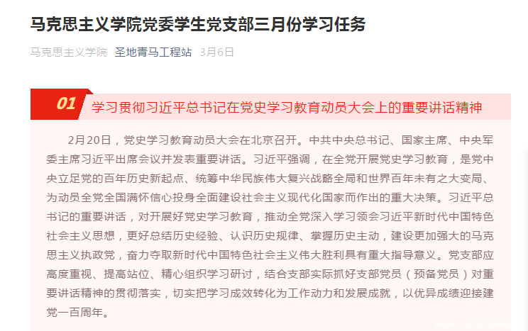 ——依托网络平台,实现有效学习。学院党委学生党支部依托圣地青马公众号这一平台,开设“圣地往事”与“家乡党史我来讲”的专栏,以诵读、讲故事的方式,图文并茂、有声有色,有效提升了党史学习教育的针对性、时效性和感染力;线上推出三月份学生党员党史学习任务,评选优秀党史学习心得笔记,遵照党史学习要求,切实增强党史学习教育的自觉性。