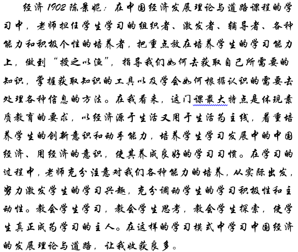 《中国经济发展理论与道路》课程跳出经济学教科书的传统框架,没有复杂的理论模型,没有繁琐的方程式,而是从经济社会中的热点和研究案例实例出发,通过当前学术界、实务部门中广泛使用的经济学分析方法和技术,通过直观的量化分析,反向理解中国经济发展的成就及其原因,直观展示经济学研究方法的应用效果,并解答数据搜集、数据处理过程中的疑难问题和常见的误区,通过课程的学习,帮助经济学专业的初学者深刻理解日常生活、创业、企业经营、对外交往等经济社会领域的经济学问题,增强学生对经济学的研究兴趣,拓展对经济学知识理解的广度和深度,帮助学生建立起经济学研究方法体系;培养学生运用经济学的思维方法,帮助其透过现象看本质,了解社会生活现象背后的经济学原理,增强其对现实的解答、解释和适应能力,为其以后的学习、工作、生活和创业提供必要的经济学基本思想、基础理论和主流方法。