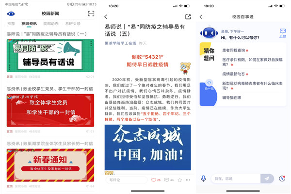 注重思想引领,细致温情服务。通过信息宣传、开设专栏、上线疫情知识库等方式,凝聚育人力量,形成育人合力。一是开展防疫宣传。除转发教育部、教育厅最新通知外,推送“致巢湖学院全体学生及家长的一封信”“致全校学生党员、学生干部的一封信”“这个春节我们一起承诺”等推文,号召全体同学要增强责任意识和防范意识,学生党员、学生干部要砥砺政治品格、彰显使命担当;二是推送原创推文。开设“易”同防疫之辅导员有话说专栏,定期上线辅导员原创推文,开展知识宣讲、假期生活学习指导和心理疏导,架起无线的沟通桥梁;三是活用校园百事通。通过上线疫情知识库为师生提供实时防疫的互动百科问答,提供肺炎疫情实时情况、病状介绍、治疗与预防、个人防护等多方面内容。