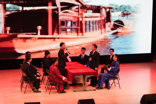 诵读会分为“开天辟地、艰辛探索、伟大转折、时代凯歌”四个篇章。每个篇章分别由影音剧、歌舞、诗歌朗诵和思政课教学等部分组成。“开天辟地”从1921年中国共产党成立讲起。影音剧《红船》再现了党的一大召开的场景,将南湖之畔的风雨兼程、一往无前娓娓道来;诗朗诵《长征》回忆了那段艰苦卓绝的岁月;《五月的鲜花》将东大学子的拳拳报国心淋漓尽致地展现。“艰苦探索”带领我们一同回忆社会主义建设初期那段探索开拓的艰苦岁月。《进京赶考》带领我们重温建国重大使命;诗朗诵《谁是最可爱的人》将抗美援朝的回忆画卷徐徐展开。“伟大转折”篇中,诗朗诵《伟大的觉醒》《春天的故事》让观众们在激情澎湃的诵读中感动,更在心灵深处感受到改革开放以来的累累硕果。“时代凯歌”篇讴歌了中国人民在中国共产党领导下共同书写新时代的壮丽华章。诗朗诵《英雄》带领我们一起回忆在战“疫”期间奋战在我们身边的平凡英雄;《同向同行》生动再现东大人自强不息的精神谱系、知行合一的求真探索和时代担当。