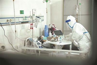 华中科技大学附属协和医院的医护人员在隔离病房救治患者。华中科技大学供图