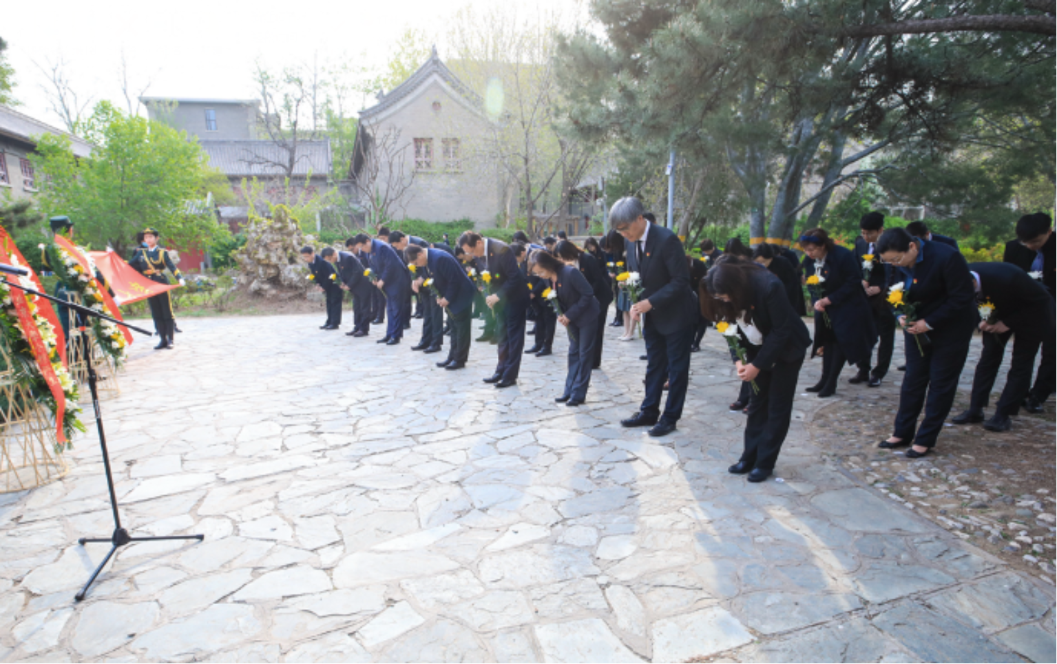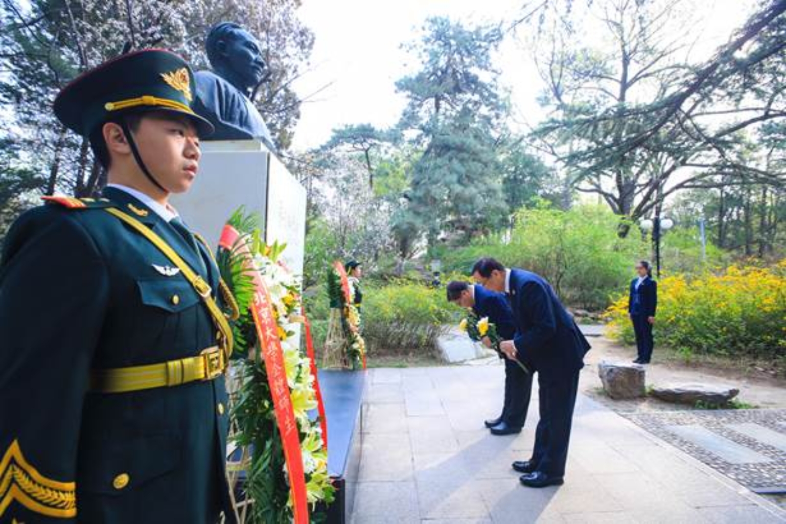 全体师生面向革命烈士纪念碑鞠躬三次,瞻仰纪念碑,并依次向革命烈士纪念碑、李大钊同志雕像、蔡元培先生雕像敬献鲜花。