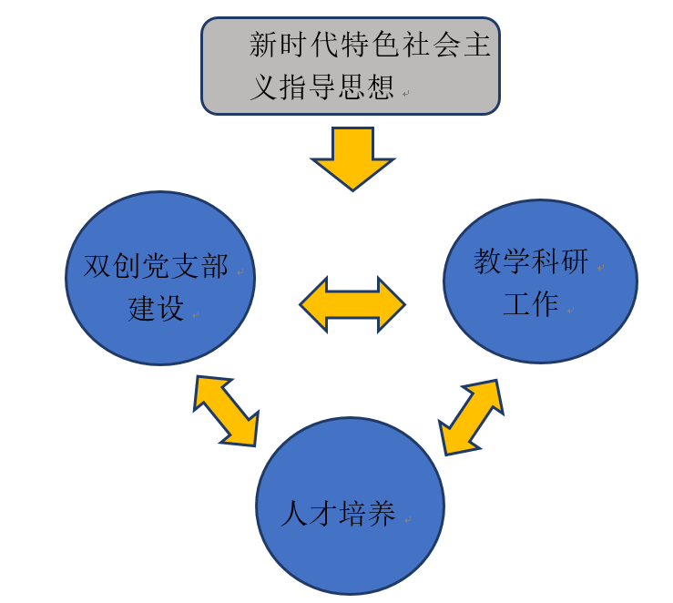 以习近平新时代中国特色社会主义思想和党的十九大精神为指导,将党建双创工作与教学科研、人才培养相结合,形成双发展模式,努力提高本系教学、科研水平,培养忠诚干净担当的高素质工程技术人才。