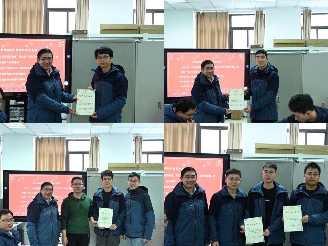 在热烈的掌声中,由邱明波老师作新年讲话。“不积跬步,无以至千里;不积小流,无以成江海。”正因为电光制造团队各优秀成员的涓涓细流,团队才能够在科研工作中滴水穿石、远行千里。主持人为大家展示了电光制造团队2021年读个人光荣榜,刘富玺、于子洋、娄桂宾、张寒旭、徐原野、陈志鹏、张子凡、周顺程光荣上榜,通过优秀个人激励其余同学奋发向上,砥砺奋进。