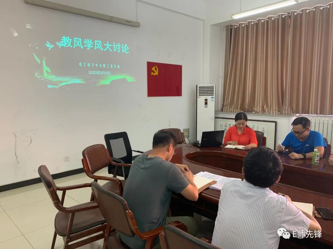 为扎实推进学校教风学风建设年活动,努力营造崇教尚学的浓厚氛围,电工电子中心教工党支部与中心全体教师一起,于2020年9月9日,在23-E212开展了“教风学风大讨论”活动。