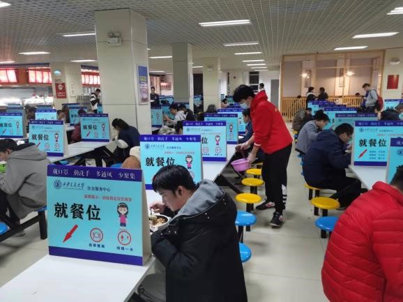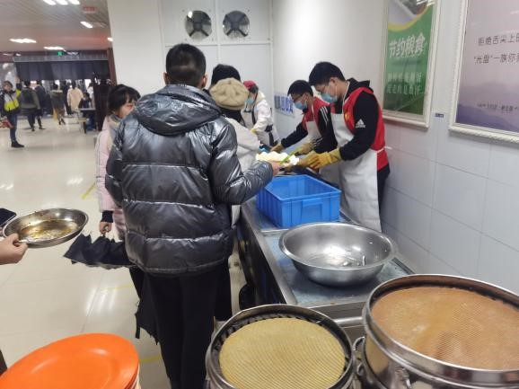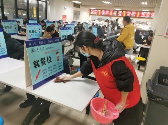 在用餐高峰期时,志愿者们有序分为三个工种,一部分志愿者来到餐具回收处处理餐盘中的剩饭,保证餐具回收的有序性、顺畅性,另一部分用拖把处理洒在地上的汤汁,保障地面的干净及来往人群的安全,其余志愿者四处清理餐桌,间接缓解用餐高峰期座位不足的问题,为师生用餐提供便利。