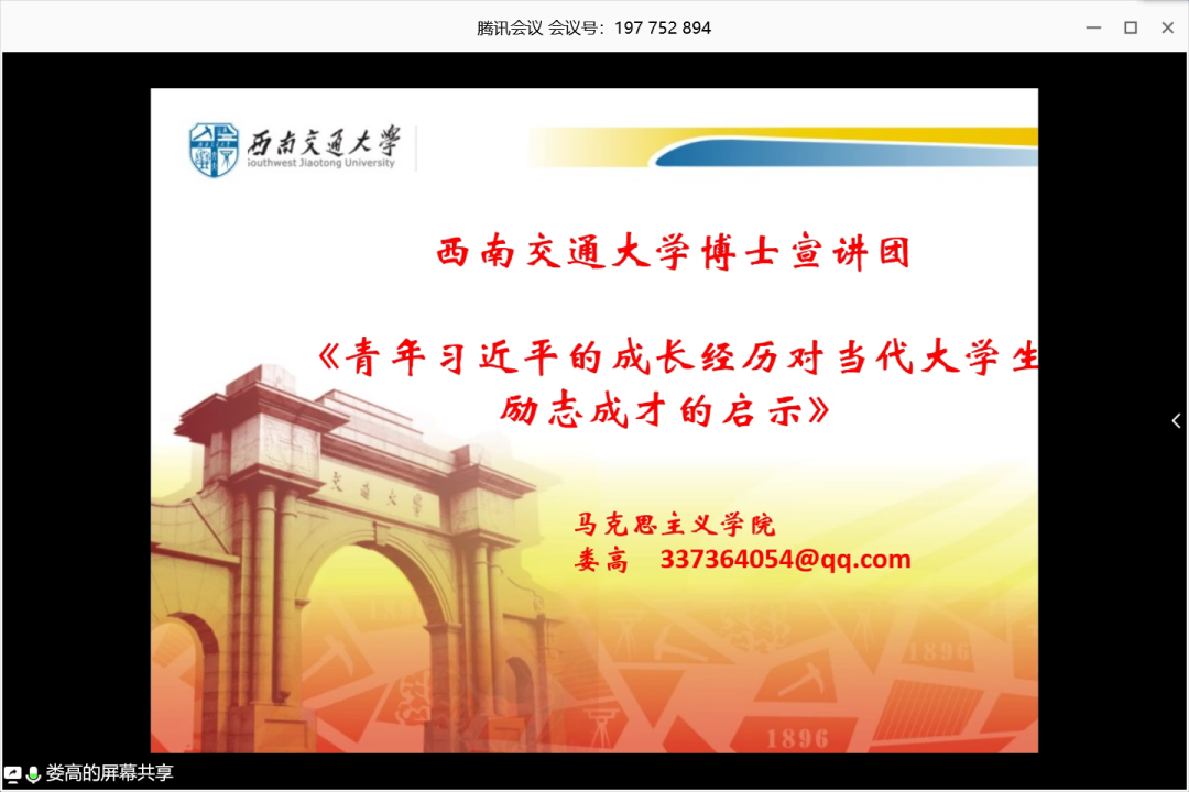 为落实校团委和各单位对团学干部、团员骨干的培训要求,提升广大参培学员的思想水平、能力本领,加强三院(中心)团委的联系和团员间的交流,马克思主义学院团委、数学学院团委和心理研究与咨询中心团委于4月23日15:50召开了“青马工程”第一期团课“青年习近平的成长经历对当代大学生励志成才的启示”。主讲人为西南交大博士宣讲团优秀宣讲员娄高博士,共290名师生参与,团课由我院团委书记赵晨主持。