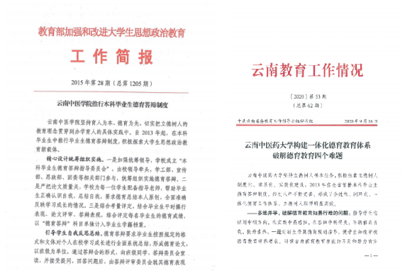 积极构建“135451”育人模式,把思想价值引领贯穿育人全过程和各环节。深挖医学生培养“德”之本源,开展一体化德育实践,连续11年组织本科生进行德育答辩。扎实推进党建进学生社区,加强中医药文化育人品牌建设,主动占领学生“思想、学习、生活”三大领域,打通中医药特色育人“最后一公里”。培育“学读用经典”“信仰的力量”“医者岐黄志”“奔跑中药星”“针康文化节”等学生活动品牌,重点打造“和合屋诚信无人超市”德育实践教育平台。1个学院入选云南省“三全育人”示范院系,5项校级“三全育人”综合改革试点项目和3项“十大育人”体系改革试点项目成效凸显。