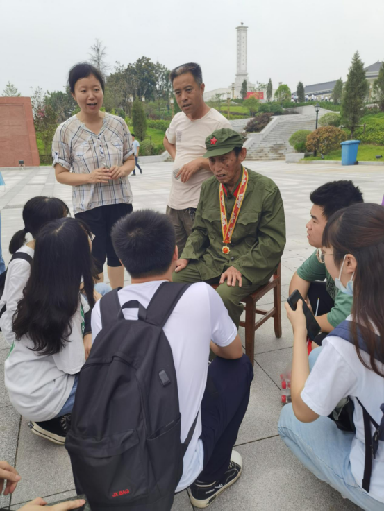 图 3徐古革命烈士纪念碑下,同学们听老兵讲革命战争