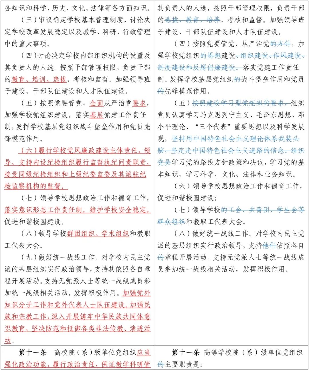 七是增写“领导和保障”章节,压实各级党委、有关部门党组织抓高校基层党组织建设的工作责任和高校党委的主体责任,对加强高校党建和思想政治工作队伍建设,强化考核评价等提出要求。同时,注重保持党内法规的权威性、严肃性、连续性,对原《条例》中经实践证明行之有效的要求,能保留的尽量保留。