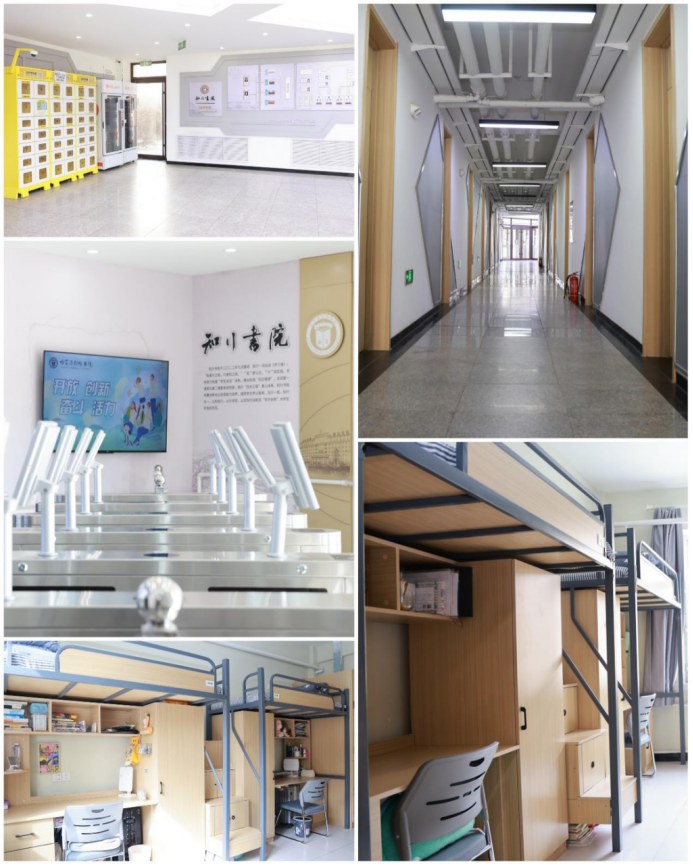 服务师生,营造温馨校园环境。为满足学生对住宿环境提档升级的要求,学校先后对6栋学生宿舍进行装修改造,标准四人间,上床下桌,层层有卫浴,配备共享热水器、洗衣机、吹风机,部分配备烘干机,楼内无线网络覆盖。学生公寓集书院文化于一体,着力打造“一站式”学生综合服务社区。公寓内公共区域均配有图书自习室、党团活动室、辅导员工作室等,为学生提供了舒适的生活环境。全部达到“书院制”学生公寓标准,为学生创造了“剑桥新家胜过快乐老家”的生活环境。