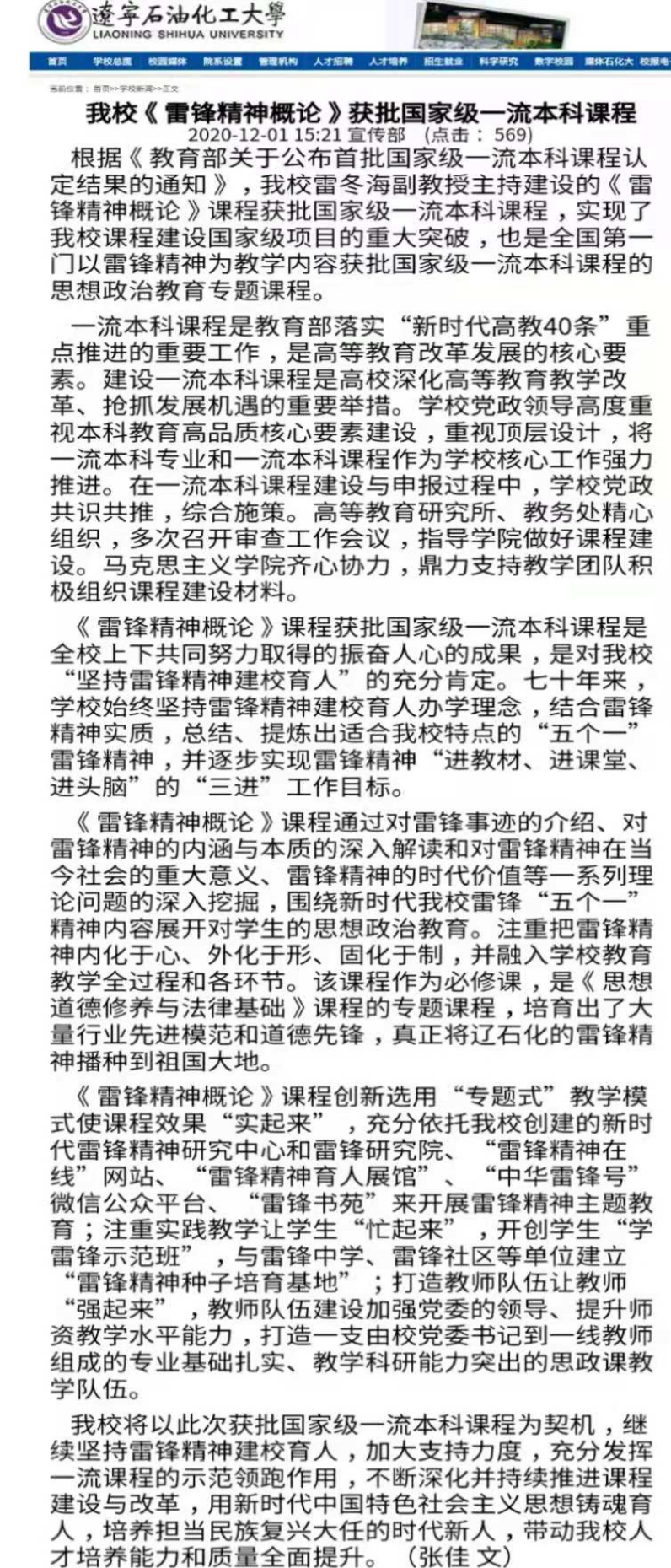 学校积极探索思想政治理论课的教学改革,大力实施了雷锋精神“进教材、进课堂、进头脑”的“三进”工程。其中《雷锋精神概论》课程就是学校多年传承和深入研讨雷锋精神的最为重要的教学成果。《雷锋精神概论》课程是由辽宁石油化工大学马克思主义学院开设的面向全校本科生的一门思想政治理论教育的通识课,为增强课程的实效性,我们不断拓展课程教学内容的广度和深度。2006年学校组织相关专家、学者共同编写了国内第一本雷锋精神的本科生教材《雷锋精神教程》。2012年6月,围绕学校多年来学习雷锋精神活动的成果积累而形成的雷锋精神的“五个一”重新编写了《雷锋精神概论》教材。2020年为贯彻落实习近平总书记关于学习雷锋精神的最新指示精神,我们又对雷锋精神的“五个一”的教学内容进行修改和完善,编写了这本《新时代雷锋精神简明教程》。2010年,《雷锋精神概论》课程获批辽宁省教育厅精品课程,2020年该课程获批国家线下一流课程。