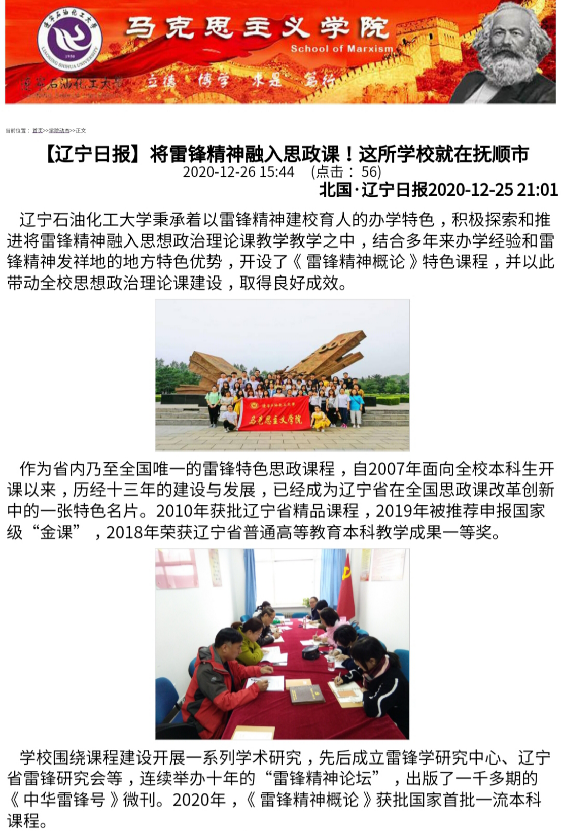 辽宁石油化工大学始终秉持以雷锋精神建校育人,依托雷锋精神的发祥地抚顺这一地域优势和文化资源优势,结合学校70年来办学实践中一直秉持的“用雷锋精神建校育人”的办学特色和办学理念,弘扬雷锋精神,培养时代新人是学校在新时代的新使命。我校建立了雷锋精神育人展馆,成立了辽宁省雷锋研究会省级学术团体,开设了《雷锋精神概论》国家一流课程,成立了抚顺学雷锋志愿者培训学院。