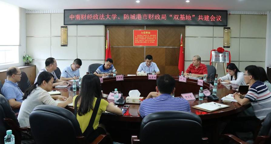 防城港市财政局刘学明副局长代表防城港市财政局对财税学院“双基地”建设广西分队的到来表示热烈欢迎,市财政局党总支、办公室、预算科、金融债务科、非税中心、企业科、社保科、人事科等科室的负责同志参加“双基地”建设签约、揭牌和座谈会。防城港市财政局党总支财税学院、副局长傅现同志参加“双基地” 挂牌活动。