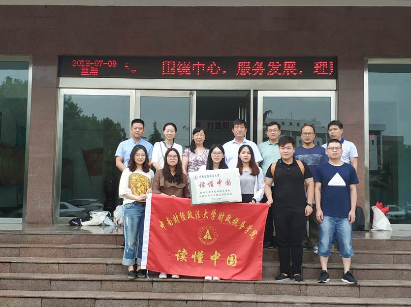 由中南财经政法大学财政税务学院周春英教授、研办主任袁媛老师带队的河南宝丰暑期社会实践队一行8人于2018年7月8日抵达河南省宝丰县,开展专业实习、青年党性培养等教育实践活动。此次暑期调研是一次寻根与实践的结合,于追溯中学习,于学习中思考,于思考中收获,于收获后升华。根据宝丰财政局的委托,结合财税热点问题展开调研,形成具有建设性意见的报告。