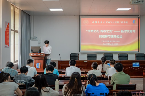 为深入学习贯彻党的二十大精神,落实学校“礼敬优秀传统文化 德润文明和谐校园”活动要求,引导青年学子践行社会主义核心价值观,弘扬“奉献、友爱、互助、进步”的志愿服务精神。4月28日,安徽工业大学学生测控党支部联合学生电气工程党支部举办“生命之礼·青春之光——新时代青年的选择与使命担当”暨“三礼”学习教育主题党日活动。活动特邀学院造血干细胞捐献志愿者、电232班学生何李浩作主题宣讲,活动由学生测控党支部书记杨恒基主持,学生党员、入党积极分子及师生代表100余人参加。
