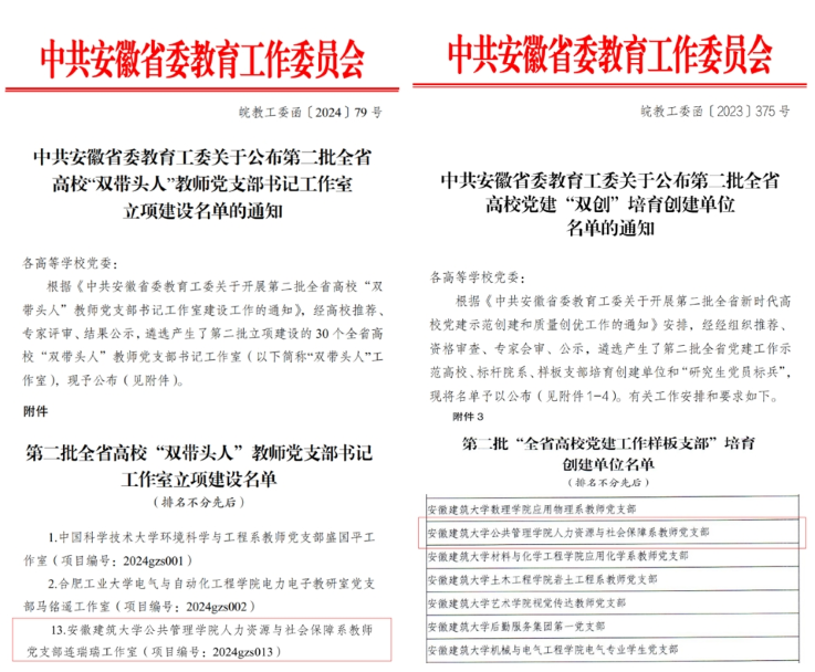 2022年10月,学校党委遴选8个“双带头人”教师党支部书记工作室培育创建单位,公共管理学院人力资源与社会保障系(以下简称“人社系”)教师党支部连瑞瑞工作室获批立项建设;2024年2月,党支部被遴选为第二批全省高校“双带头人”教师党支部书记工作室立项建设单位。在学校及学院党委坚强领导下,人社系教师党支部扎实推进“双带头人”书记工作室培育建设,坚持“七个有力”,发挥“两个作用”,扎实推进党建工作和教育教学深度融合发展。通过创新实施“1-2-3-3-3”工作法,深化理论研究,创新活动载体,着力打造“红色管理”党建品牌,培育建设取得积极成效,人社系教师党支部获批省级新时代党建双创“样板支部”培育创建单位。