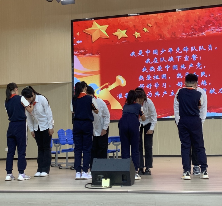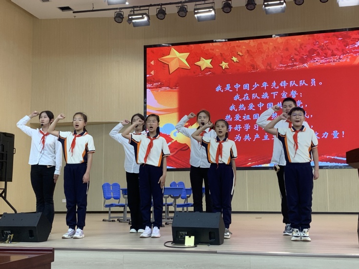 “出旗!”随着铿锵有力的出旗曲响起,鲜艳的中国少年先锋队队旗庄严入场。全体少先队员凝神注视着鲜艳的队旗,郑重地向队旗敬礼,大队辅导员宣读新队员名单后,老队员为新队员们佩戴红领巾。看着胸前飘扬的红领巾,每位新队员的脸上都洋溢着激动和自豪。这是他们期盼已久的时刻!戴上红领巾,就意味着多了一份沉甸甸的责任,一颗颗承载着美好理想的种子在他们心中悄然萌发。他们面对鲜艳的队旗,高举右手,铿锵有力地宣誓。那一刻,孩子们的眼神坚定,声音洪亮,这不仅是一句誓词,更是他们内心深处对未来的承诺。